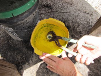 Remove the fitting that is holding the cup on now. As you can see, it is hard to get off and needs a tool. Not good.